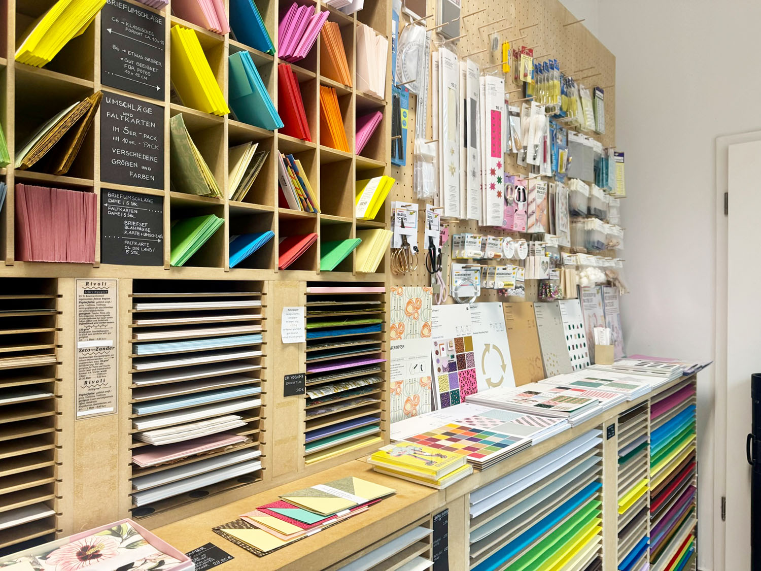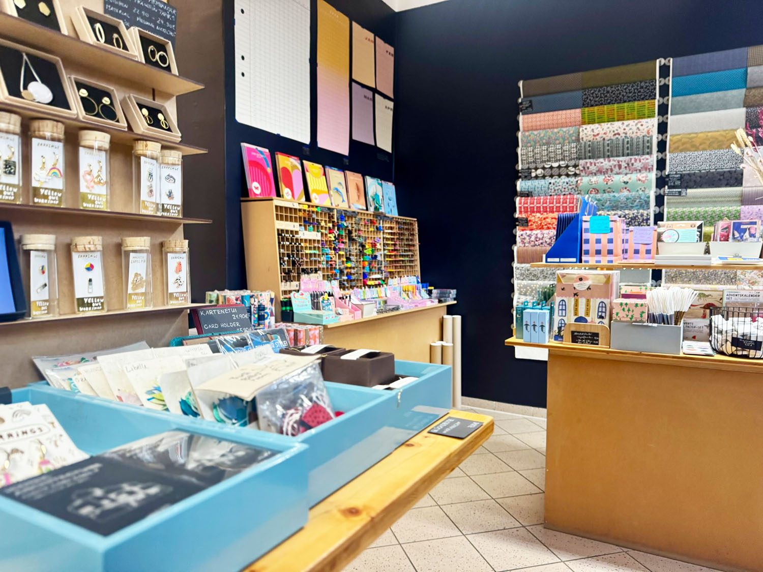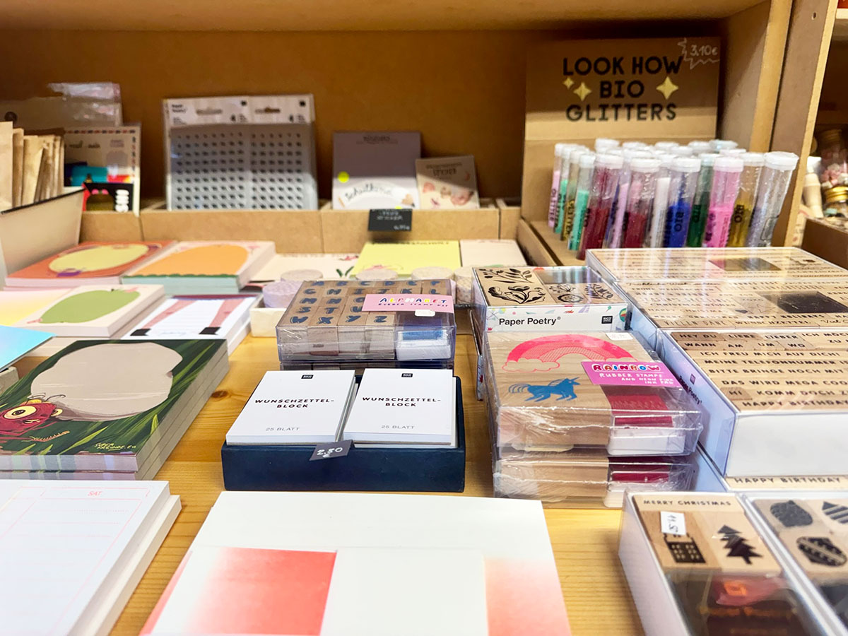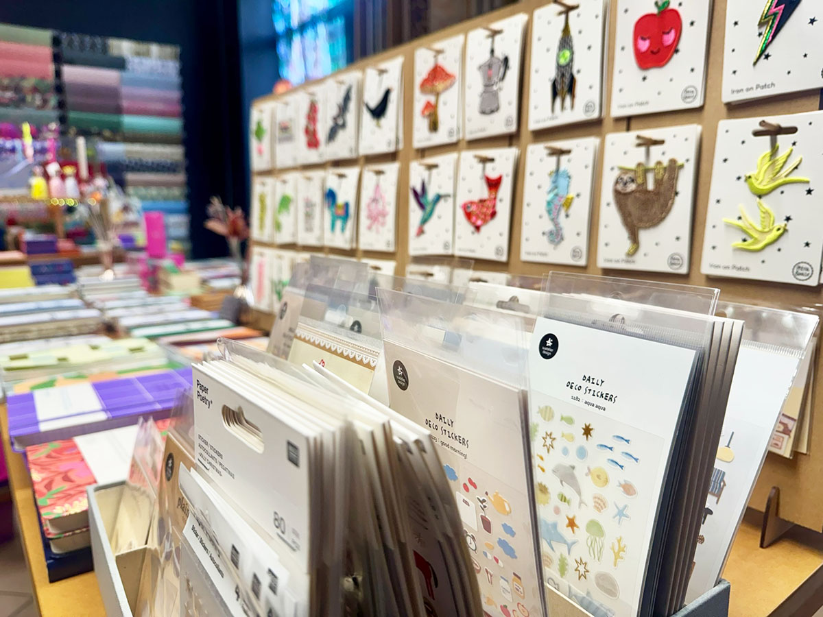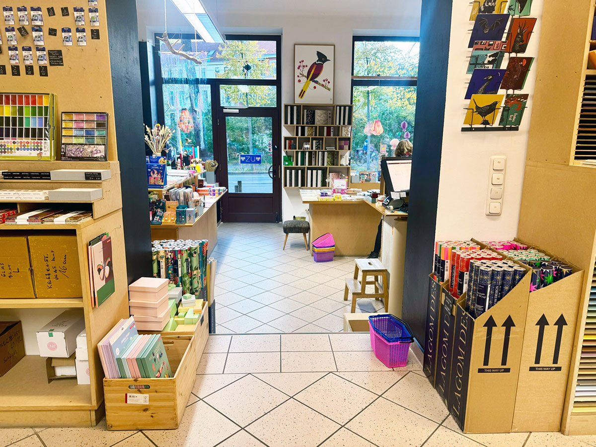 Die Regale sind bis unter die Decke gefüllt, aber nichts wirkt überladen. Fein sortierte Papierwaren in unterschiedlichsten Qualitäten, Farben und Formaten erzählen von Herkunft und Handwerk: Japanische Muster, skandinavische Zurückhaltung, verspielte Illustrationen, klare Linien.