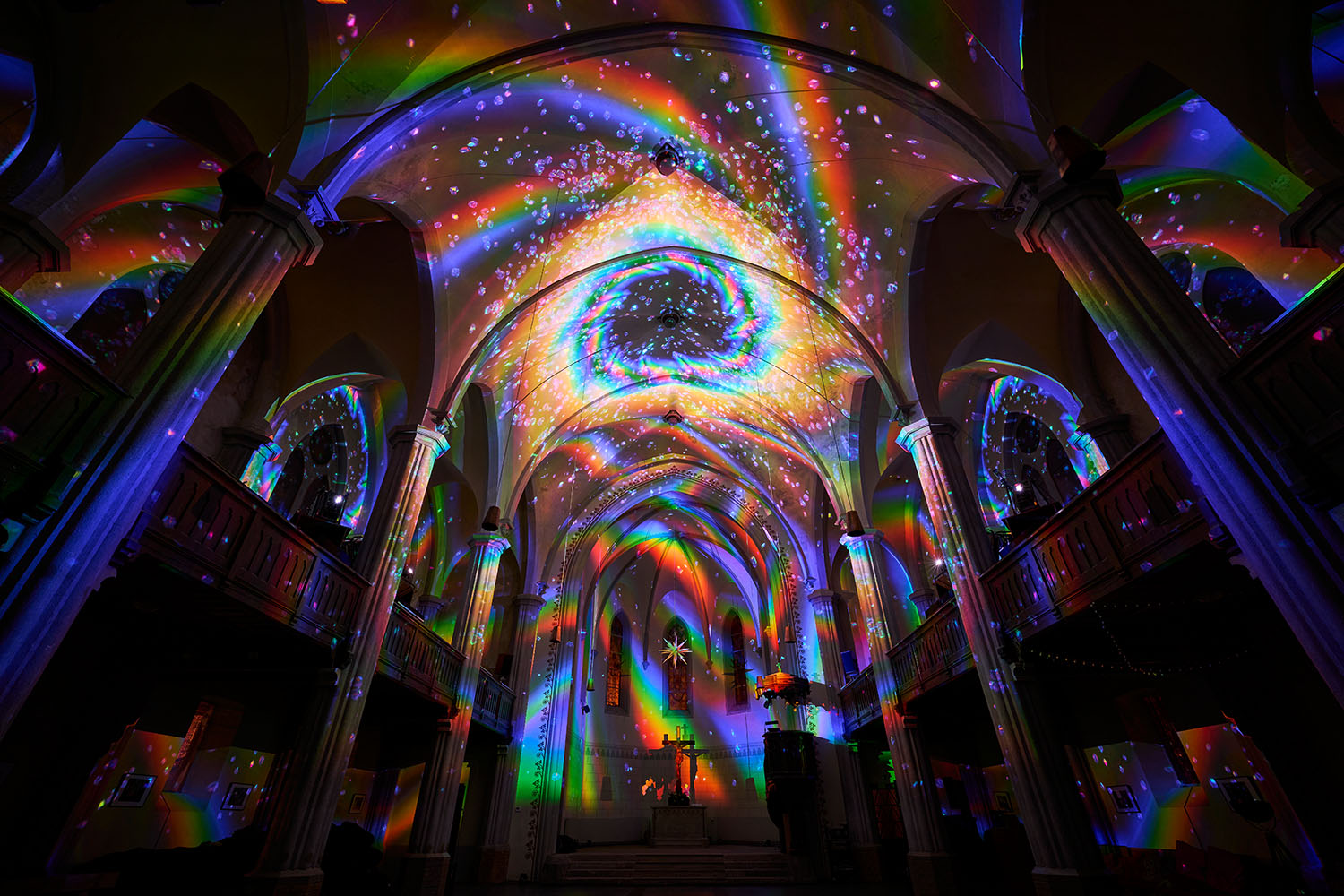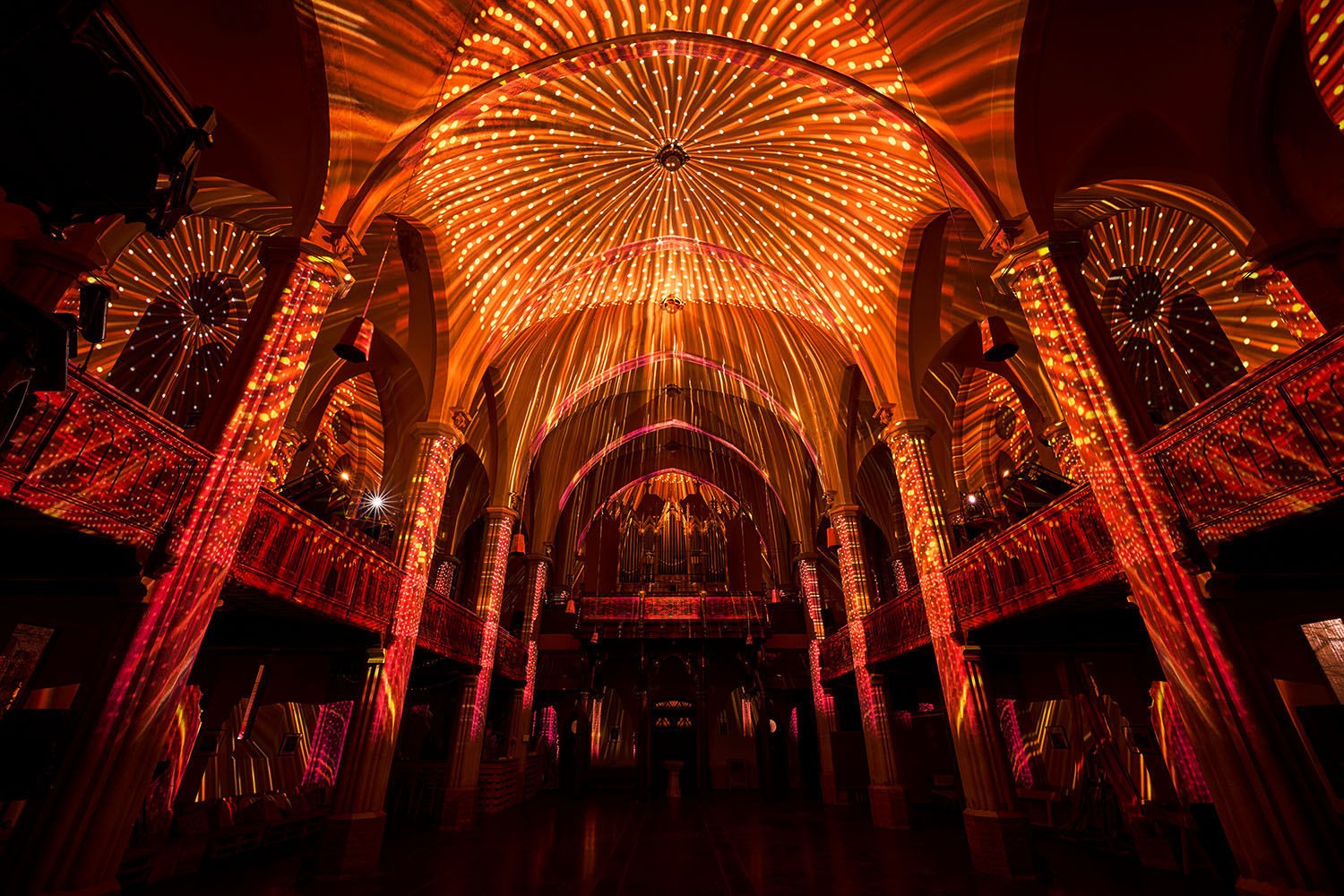 Die neogotische Friedenskirche wird dabei selbst zum Kunstwerk. Mit präziser Mapping-Technologie scheint der Raum zu atmen, die Mauern erzählen in Lichtlinien und Farben. Statt bloßer Beleuchtung entsteht ein Dialog zwischen Architektur, Geschichte und Gegenwart – eine Hommage an die Stadt und ihre spirituelle Energie.