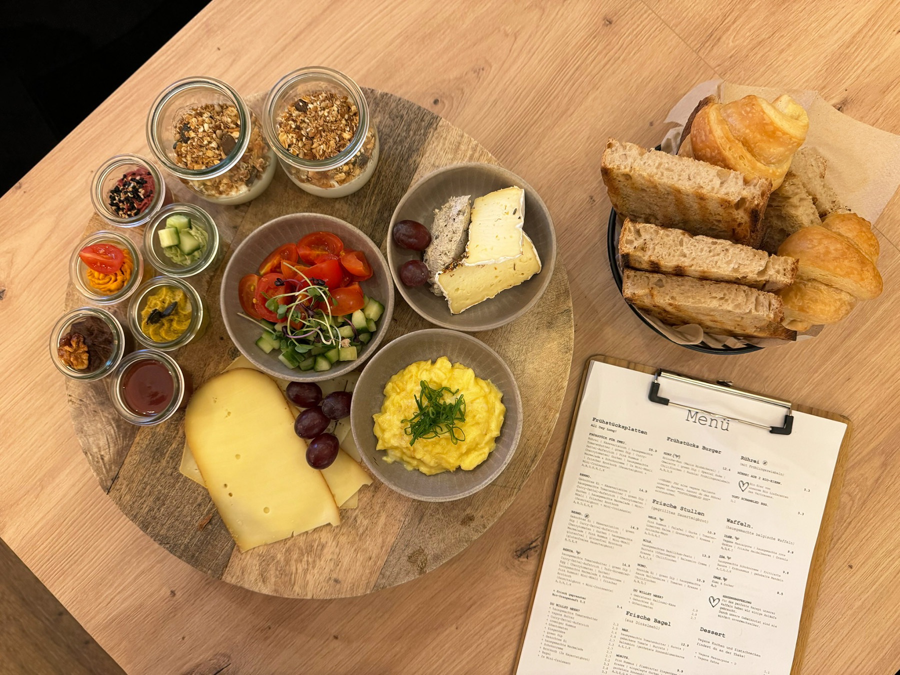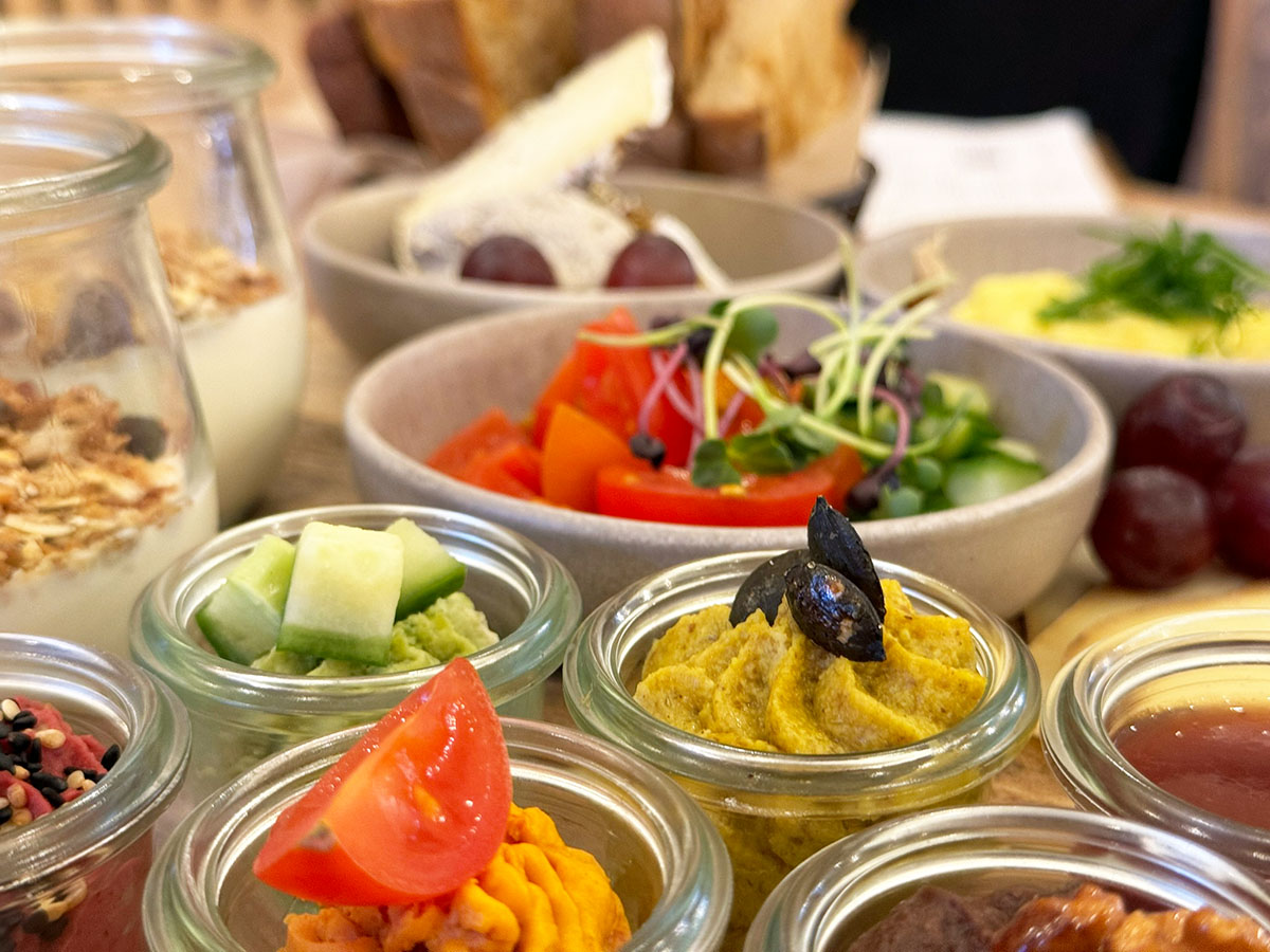 Die famosesten Aufstriche vom Pink Hummus, über den Green Dip auf Edamame-Basis bis zum Curry-Dattel-Aufstrich lassen zaubern ein kunterbuntes Schlaraffenland auf den Frühstückstisch des HIN & VEG. Ein mega frischer Brotkorb samt Sauerteigbrot und Croissants, duftendes Rührei und Käsevariationen locken die herzhaften Geschmacksknopsen aus dem Winterschlaf.