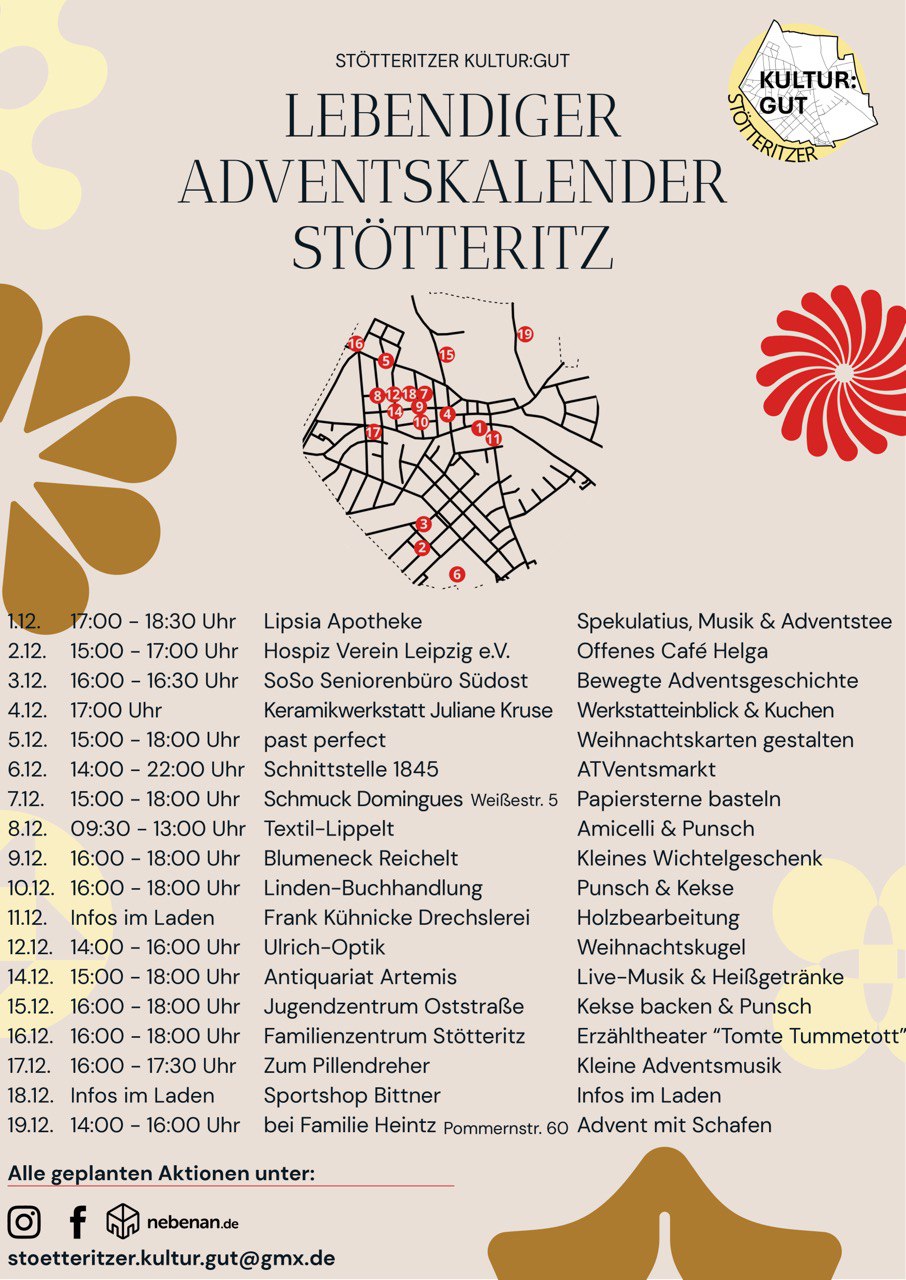 Organisiert vom Stötteritzer Kultur:Gut verbindet der Lebendige Adventskalender Händler:innen, Vereine, Handwerksbetriebe, Ateliers, Familien und Nachbar:innen miteinander. Jeden Tag öffnet sich eine neue „Tür“, hinter der sich ein kleines Programm verbirgt: mal kreativ, mal gemütlich, mal musikalisch, aber immer echt und nahbar.