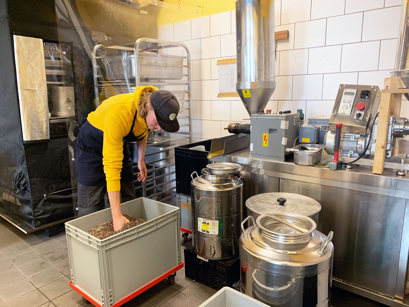 In der Klinge 22 teilt Patrice sich einen idyllischen Gewerbehof mit allerhand weiteren tüchtigen Fabrikaten. Viel Platz braucht seine Ölmühle nicht. Was nach einem Koloss klingt, passt in Wirklichkeit gemütlich in eine Gemeinschaftsküche. Und produziert dann auch noch etwas, was der Gemeinschaft mehr als dienlich ist.