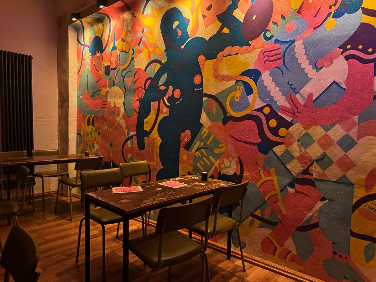 Im Inneren trifft Barästhetik auf Kiezcharme. Schwarze Fliesen, leuchtendes Licht, alte Möbel und ein Wandbild, das allein schon den Besuch wert ist. Das Werk stammt vom Leipziger Künstler Luke Carter, der die Hinterzimmerwand in eine bunte Explosion aus Körpern, Linien und Farben verwandelt hat. Ein Mosaik der Diversität – laut, schön, selbstbewusst.