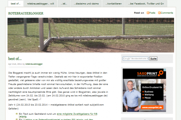 Umso gespannter war ich darauf, vor welche Herausforderungen mich die Vorstellung eines Blogs stellen würde, in dem es um nichts anderes als Fußball geht. Hui. Und ich weiß nicht, wie ich Matthias danken soll, denn ob er es wollte oder nicht, hat er mir mit seinen ersten beiden Blogseiten den Einstieg in sein für mich ach so undurchschaubares Thema einfacher gemacht, als ich es mir hätte erträumen können. In seinen Übersichten „Rotebrauseblogger … will“ und „Rotebrauseblogger ist …“ lässt auch mich als absoluten Fußballlaien langsam und behutsam in sein RB Universum gleiten und vermittelt mir mit wenigen Worten auf Anhieb die Gründe – verbunden mit einem tiefergehenden Verständnis – was es mit der Leipziger Fußballhistorie auf sich hat und warum gerade RB Leipzig die Chance nutzen konnte, sein Herz im Sturm zu erobern.
