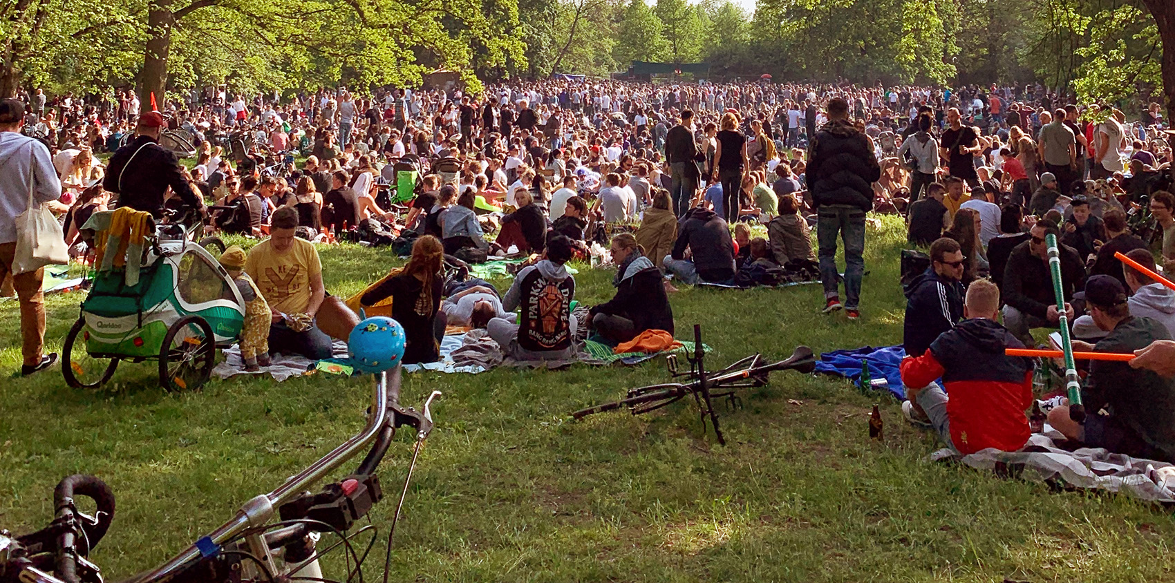 Zwischen Decken und Fahrrädern verwandelt sich die Wiese in einen Patchwork-Teppich bunter Grüppchen und Schaulustiger, die von der Musik angelockt werden. Vor den Boxen schwillt der Pulk sich im Takt bewegender Körper von Stunde zu Stunde.
