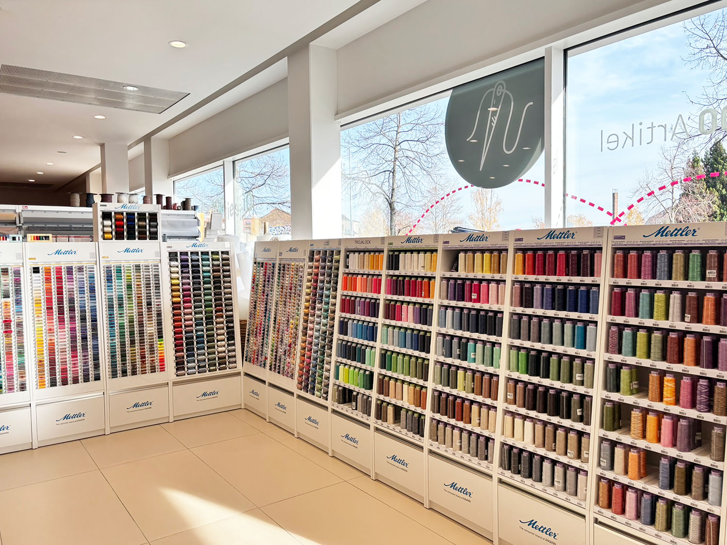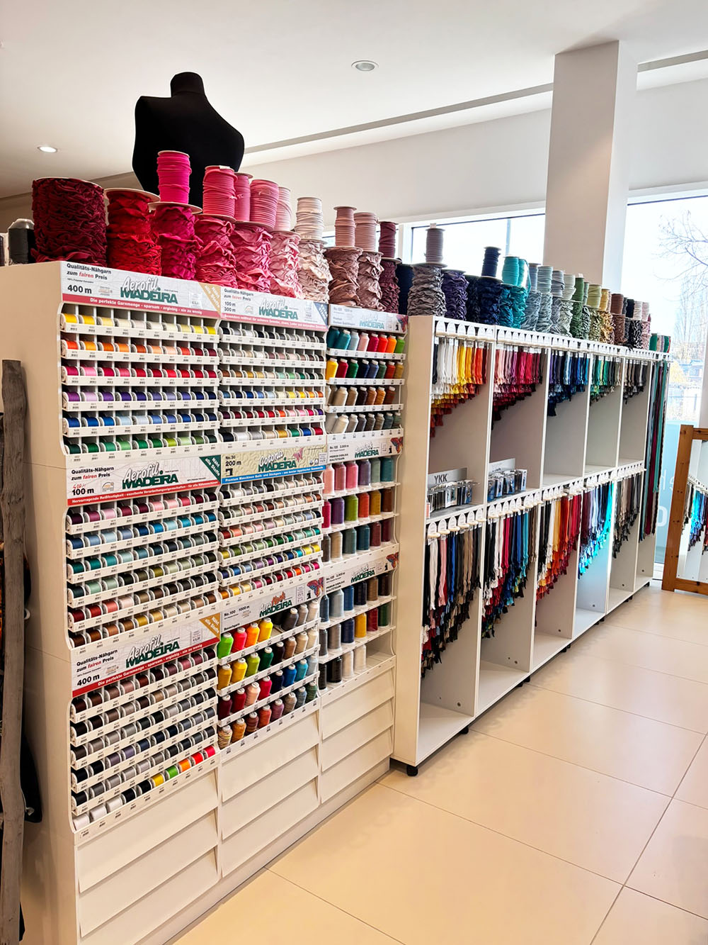 Zwischen Stoffballen und Zubehör wird deutlich: Das Stoffekontor versteht Nähen nicht als Hobby für Zwischendurch, sondern als Handwerk, das Raum verdient. Entsprechend umfassend ist das Sortiment an Nähzubehör – von Garnen über Nadeln, Reißverschlüsse, Knöpfe und Bügeleinlagen bis hin zu Schnittmustern, Büchern und Zeitschriften.