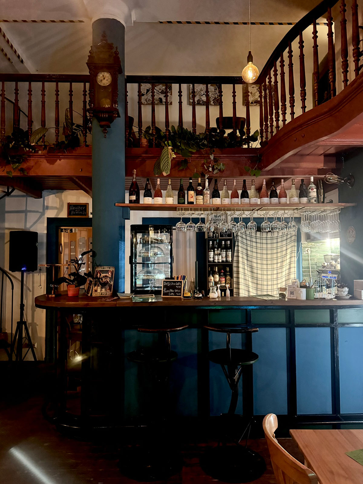 Das Herzstück des Cafés ist ohne Frage die Empore. Ein Ort für alle, die kurz aus dem Trubel verschwinden wollen – und ihn gleichzeitig im Blick behalten. Von oben fällt der Blick sanft hinunter ins Café, auf arbeitende Menschen, leise Gespräche, dampfende Tassen.